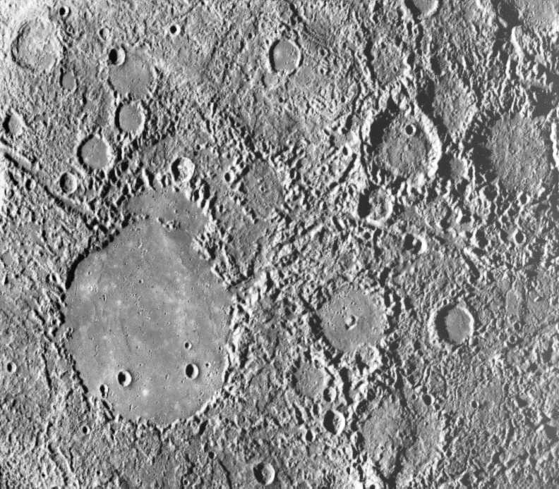 "Weird terrain" best describes this hilly, lineated region of Mercury. This area is at the antipodal point from the large Caloris basin. The shock wave produced by the Caloris impact was reflected and focused to this antipodal point, thus jumbling the crust and breaking it into a series of complex blocks. The area covered is about 100 kilometers (62 miles) on a side. (Copyright Calvin J. Hamilton; FDS 27370) |
